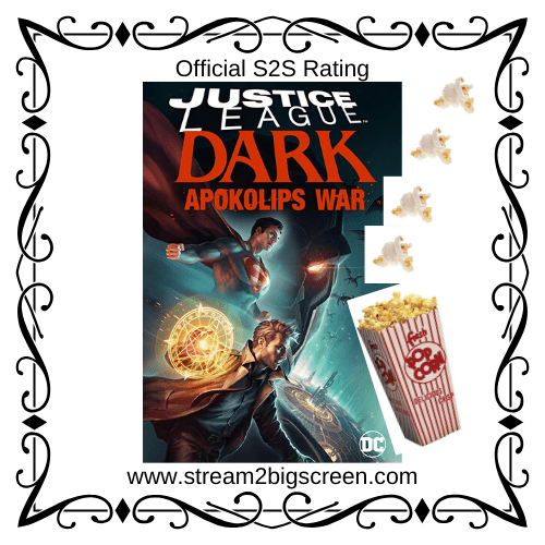 Welcome, welcome, welcome. Stream to Big Screen is back with a review of a highly anticipated release of Justice League Dark: Apokolips War. This animated streaming film was released May 5, 2020. Apokolips War is the sequel to Justice League Dark (2017) involving Jack Kirby’s New Gods. Apokolips War shows us the epic battle between Earth’s favorite league of heroes, and heroes in training, with SUPERVILLAIN, Darkseid. But let’s get to the pros and cons.