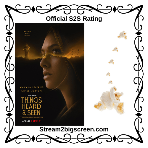 Needless to say based on this review, Things Heard and & Seen is a single popped kernel. The movie tries pretty hard but ultimately it falls flat. A horror, thriller that lacks true horror or thrilling moments is meant to be released through Netflix but doesn’t need to be watched unless under duress.