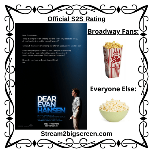 Generally, Dear Evan Hansen comes together to be faithful adaptation of a popular musical. It is a star vehicle for Ben Platt, and while he may be miscast due to his age, he does a great job delivering the songs and emotions of the story. If you are a fan of the stage version, you should enjoy the movie version; and get your big box of popcorn. For the others out there, there are enough problems that you may find it overall contrived and hokey – but the music is still great. Get a bowl of popcorn and sing along once you’ve learned the songs.