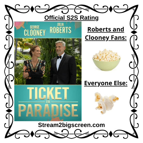 For me and the non-Roberts and Clooney stans, I would not go to the theater to see Ticket to Paradise. While it’s nice to see Roberts and Clooney on a big screen again, I wish it were in a better movie. This one will be on some streaming service some day soon, so keep your one popped kernel for that rainy day. For real Julia Roberts and George Clooney stans, I guess you’ll like this because you’ll like anything they are in, and this movie is just whatever. For real, only pay for a matinee, don’t spend your date night money on this one – just a bowl of popcorn.