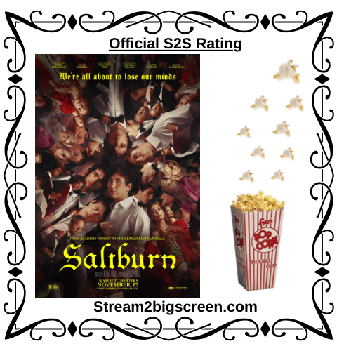 Ultimately, Saltburn is an entertaining and darkly comic psychological thriller. It takes big swings and makes a familiar plot new with off kilter details. A strong script and a capable cast bring energy to this film that is sometimes hard to watch but also hard to forget. This movie is worthy of a trip to the theater, and make sure you grab a big box of popcorn on the way to Saltburn.