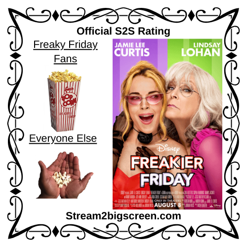 Ultimately, Freakier Friday is a cute movie with broad, Disneyfied comedic moments. While the plot is basically the same as Freaky Friday (2003) and every other body swapping movie, Lindsay Lohan and Jamie Lee Curtis have such great chemistry that they show why this sequel is worthwhile. Fans of the original will probably get joy from the boost of nostalgia while everyone else can just enjoy this fun family movie. If you love the original, grab a big box of popcorn; but, if this is your first go round with Lohan and Curtis, you can wait for this to show up on Disney+ with a handful of popcorn.