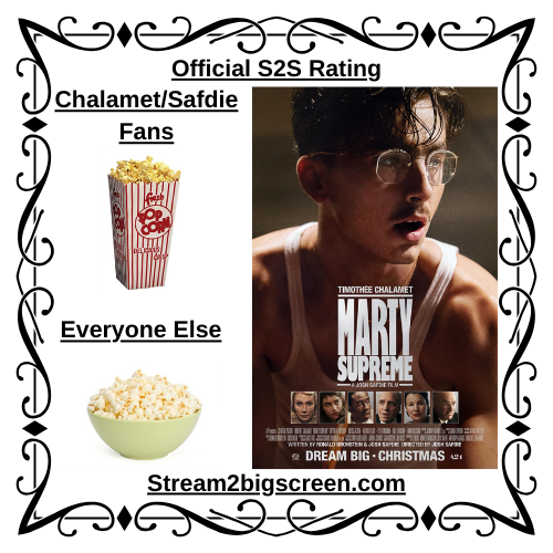What’s up, Streamers! We’re still playing catch up on the glut of Christmas releases. Luckily, a number of these movies have Oscar aspirations which keep them relevant through January like Josh Safdie’s sports drama, Marty Supreme. In Marty Supreme, Timothee Chalamet plays Marty Mauser, a professional table tennis player, who dreams of greatness and is singularly focused on proving himself at all costs. The movie follows Marty as he hustles for the money that will get him to an international table tennis tournament. Anxiety-inducing dog wrangling and ping pong hijinks ensue.